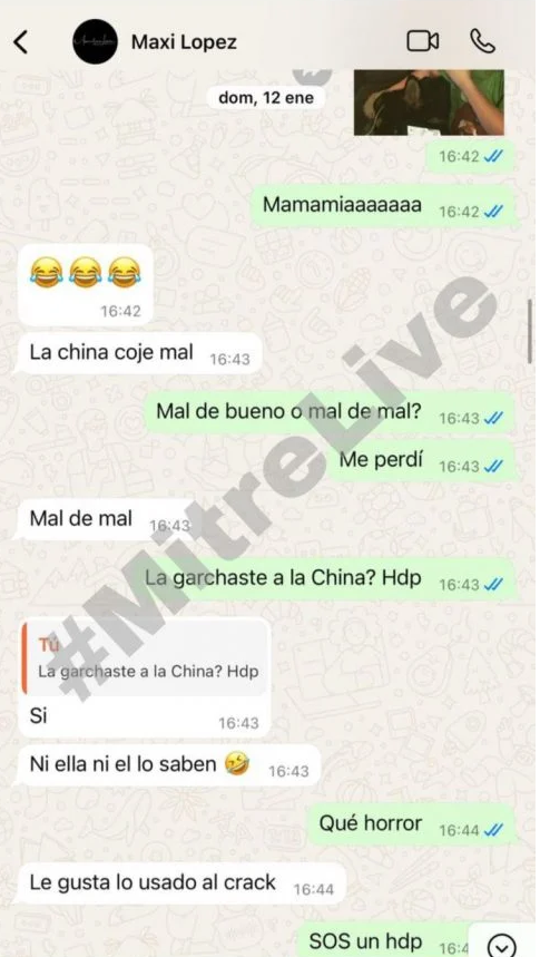 Según se observa en la captura, Maxi le confesaría a la modelo haber mantenido intimidad con Eugenia la China Suárez en el pasado.