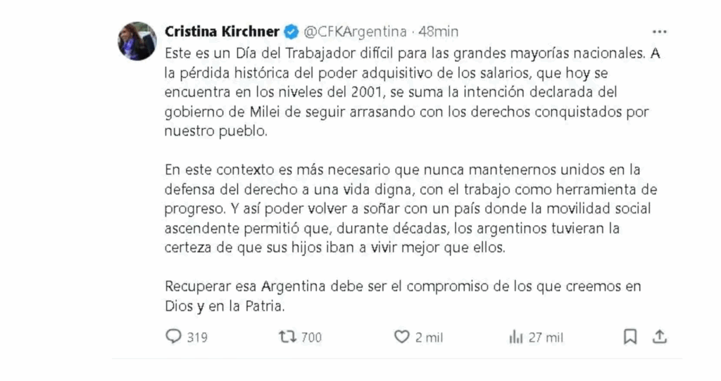 En medio de la interna del PJ y la tensión con el gobierno de Axel Kicillof, Cristina Kirchner publicó un mensaje por el Día del Trabajador con duras críticas a Javier Milei. La expresidenta advirtió por la pérdida salarial y llamó a «mantenernos unidos» para defender los derechos laborales.