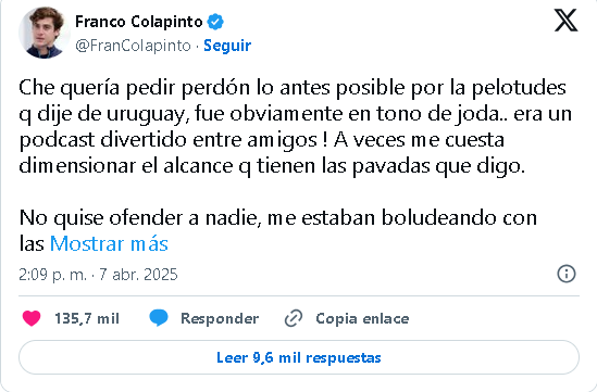 Las frases de Colapinto provocaron una inmediata reacción en redes sociales, especialmente entre usuarios uruguayos que calificaron sus comentarios como “soberbios”, “desubicados” y “una falta de respeto”. Algunos incluso reclamaron un pedido de disculpas público. Hasta el momento, el piloto de 20 años no realizó aclaraciones ni se refirió nuevamente al tema. Mientras tanto, la polémica sigue creciendo y su nombre volvió a ser tendencia, aunque esta vez fuera del mundo del automovilismo.