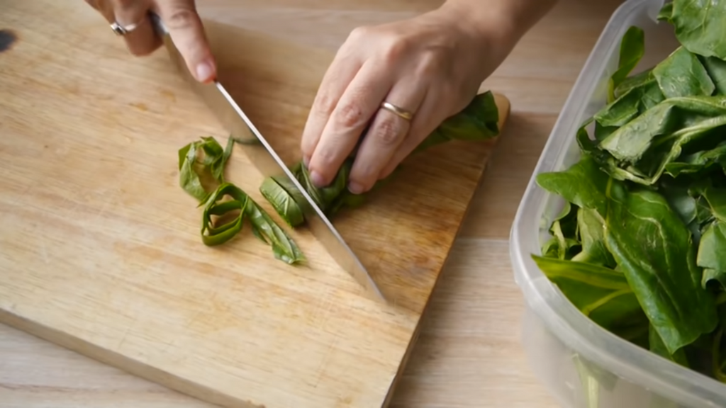 Ahora vamos con la acelga. Lo primero que vamos a hacer es cortar los tallos. Una vez que tenemos las hojas de acelgas sin los tallos, las vamos a colocar una encima de otra (de a dos o tres) y enrollarlas. Luego de colocar el rollito de manera horizontal vamos cortando en tiras finas.
