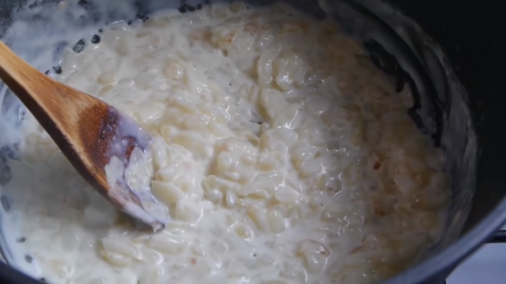 Agregar medio vaso de leche mientras revolvemos sin parar hasta que se forme una especie de salsa blanca. Si bien no es una salsa blanca tradicional, la leche va a unirse con la harina tostada y se va a generar algo muy parecido que hará que nuestra pascualina quede super cremosa. Tengan cuidado que es muy rápido, en 1 o 2 minutos lo van a tener listo y tienen que pasar al siguiente paso antes de que se pase.