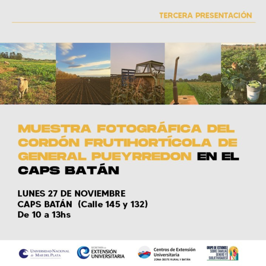 Desde el Centro de Extensión Universitaria Zona Oeste Rural y Batán de la Universidad Nacional de Mar del Plata (UNMDP), en conjunto con el Grupo de Estudios sobre Familia, Género y Subjetividades, trabajan en una actividad que busca visibilizar la ardua labor que llevan a cabo a diario los productores frutihortícolas del partido de General Pueyrredon. La misma consiste en armar una muestra fotográfica del cordón, a partir del material audiovisual y los testimonios de los protagonistas.